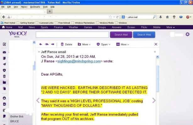 In November 2011, Soul Esprit was invited as a guest on the Rense Internet broadcast, with a listener audience of millions. Esprit’s recently published book: “When Will the Illuminati Crash the Stock Market?” was the topic of discussion. New Ager, Jeff Rense, after receiving the above email from Cointelpro agent, Marie Martine Hamel/Buchanan, soon afterward deleted Soul Esprit’s interview from his Archives. Rense is known to be adverse to Christianity, Christians, and the Christian God – Jesus Christ. Deleting the interview from his archives was done in an effort to limit Esprit’s witness to Jesus Christ and to sabotage his work exposing government corruption. This was the only time in the 30 year history (since 1994) of airing the program that Rense deleted a guest interview. Esprit’s other exposé works include: “The Criminal Fraternity: Servants of the Lie,” “Seven Who Dared,” “The Great Deception,” “The Coming of Wisdom,” “Genesis 1:29 Diet,” “Fractal Trading,” “The Globalist’s Agenda,” and other titles.